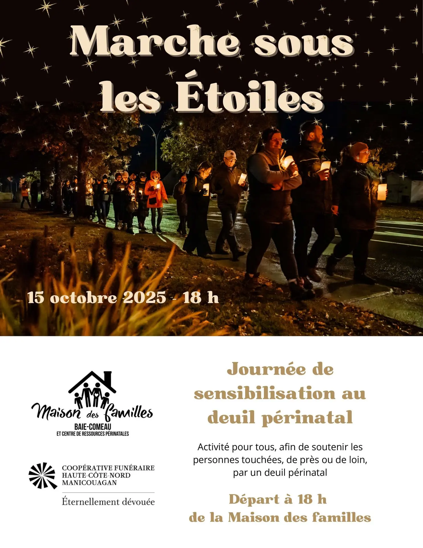 Dans le cadre de la Journée de sensibilisation du deuil périnatal du 15 octobre, La Maison des familles de Baie-Comeau | Centre de ressources périnatales de la Manic et la Coopérative funéraire Haute-Côte-Nord – Manicouagan s’unissent pour une 2e année dans l’organisation de la marche sous les étoiles à Baie-Comeau.